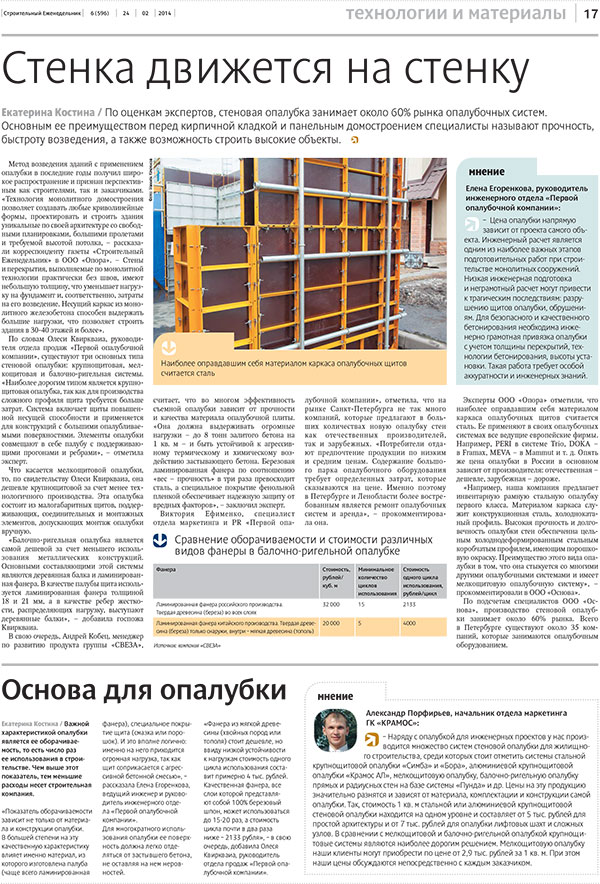 «Строительный еженедельник»Выпуск: №6 (596) Дата: 24 февраля 2014 г Статья «Стенка движется на стенку» |